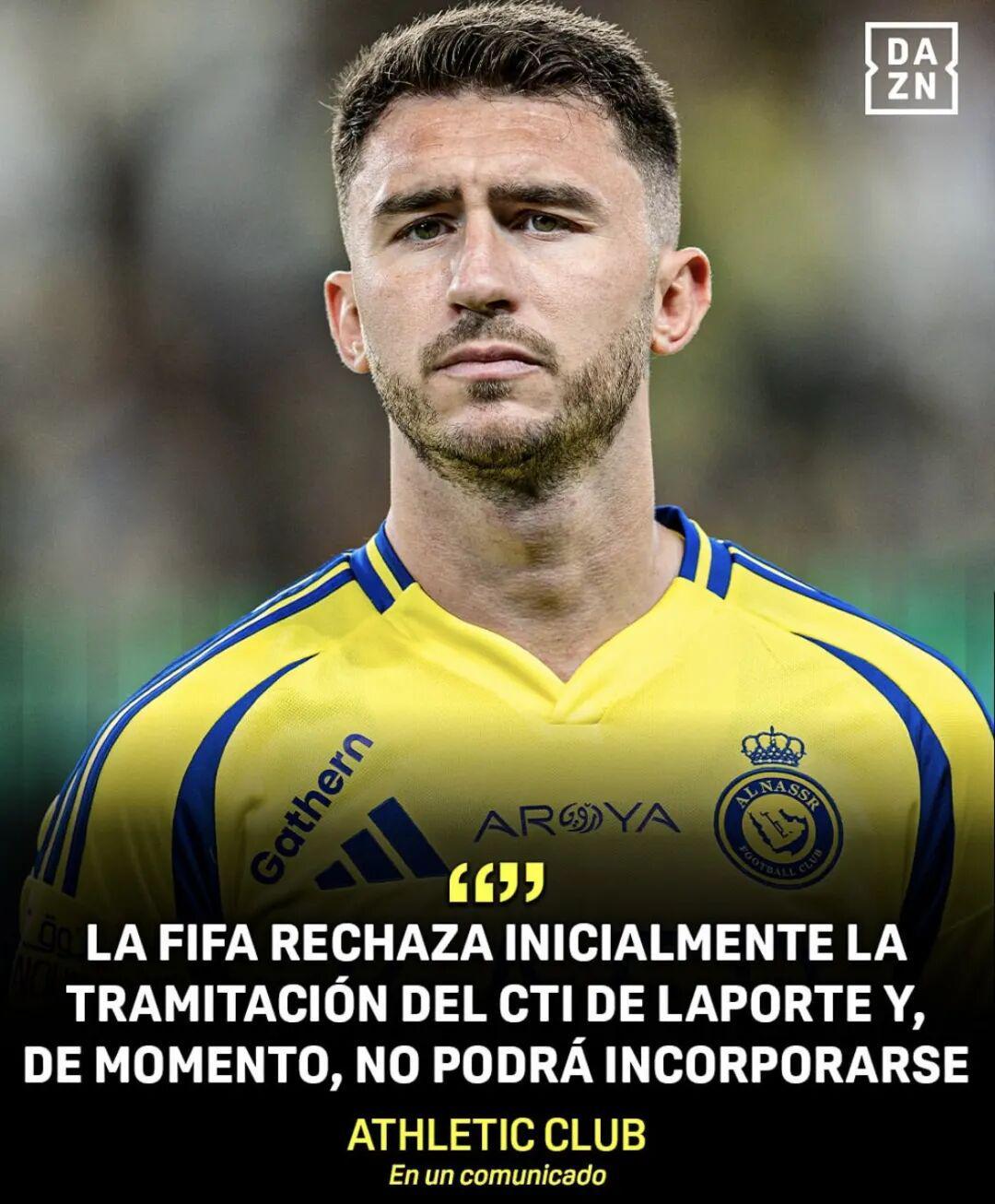 “毕尔巴鄂竞技俱乐部谨向全体会员及球迷告知:国际足联已驳回西班牙足协向沙特阿拉伯足协申请获取国际转会证明(CTI)的请求,该证明是完成拉波尔特球员注册的必要文件。”